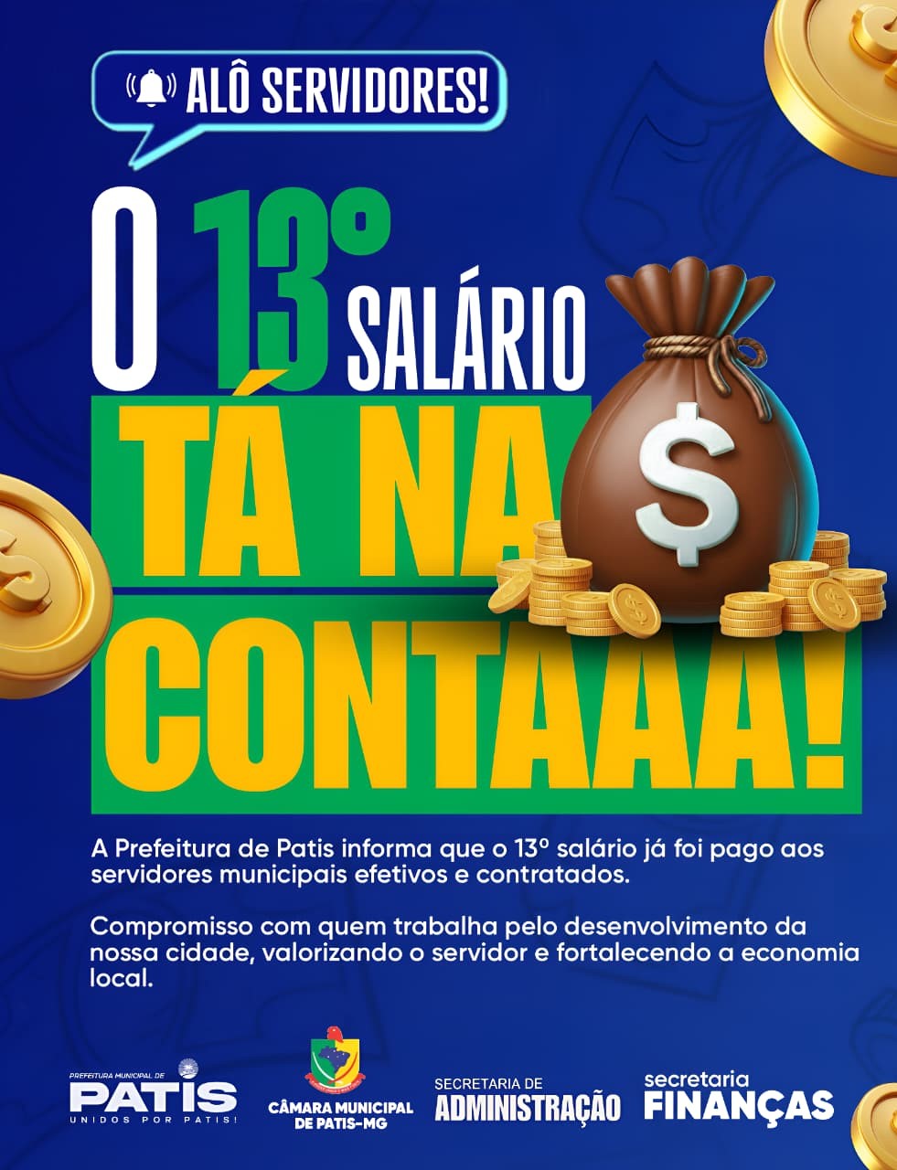 ALÔ, SERVIDOR! O DÉCIMO TERCEIRO SALÁRIO JÁ ESTÁ NA CONTA! A Prefeitura Municipal de Patis, por meio das...